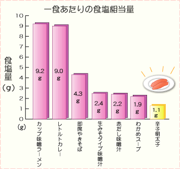 明太子の1食分(20g)に含まれる塩分量は約1.1gですが、他の食品を見てみると、味噌味のカップ麺:9.2g・レトルトのカレー:9.0g・生みそタイプの味噌汁:2.4gと思っているよりかなり少ない塩分量なのです。