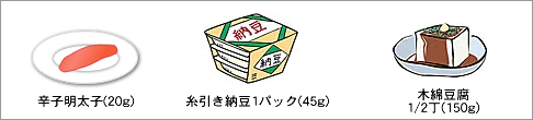 明太子:0.66gに対して納豆1パック:4.5g・木綿豆腐1/2丁:6.3gと1/10程度の脂質量です。